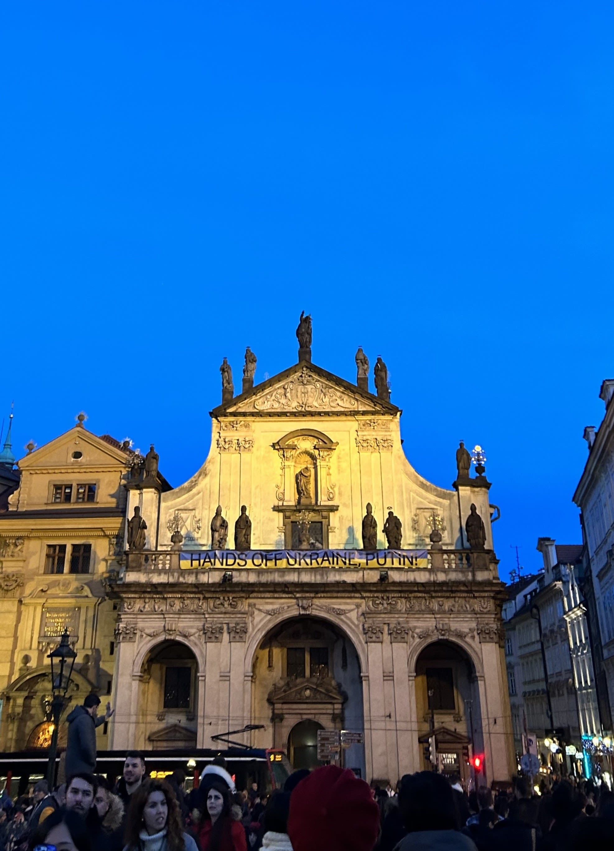 The Ukrainian flag with a ‘Hands off Ukraine, Putin!’ logo hanging on the Church of the Holy Saviour facade in Prague's historical city centre.